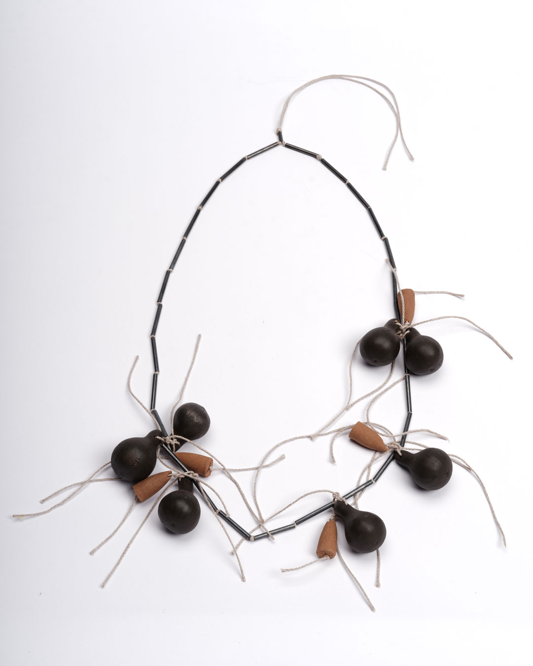 necklace; silver, gourds, metalier, incense, flax cord